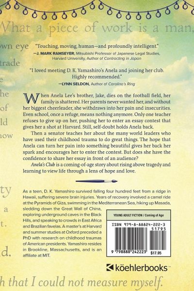 "An inspiring story of teenage resilience and how trauma need not be an insurmountable obstacle." - Kirkus Reviews "Anela's inspiring journey is a testimony to how we all can rise from traumatic darkness to brilliant change and growth." -Joanne P. McCallie, Six-Time NCAA Women's Basketball Coach of the Year, Duke University, Author of Secret Warrior (Köehler) When Anela Lee's brother, Jake, dies on the football field, her family is shattered. Her parents never wanted her, and without her biggest cheerleader, she withdraws into her pain and insecurities. Even school, once a refuge, means nothing anymore. Only one teacher refuses to give up on her, pushing her to enter an essay contest that gives her a shot at Harvard. Still, self-doubt holds Anela back. Then a senator teaches her about the many world leaders who have used their childhood trauma to do great things. The hope that Anela can turn her pain into something beautiful gives her back her spark and encourages her to enter the contest. But does she have the confidence to share her essay in front of an audience? Anela's Club is a coming-of-age story about rising above tragedy and learning to view life through a lens of hope and love.