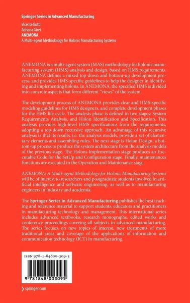 ANEMONA is a multi-agent system (MAS) methodology for holonic manufacturing system (HMS) analysis and design. ANEMONA defines a mixed top-down and bottom-up development process, and provides HMS-specific guidelines to help designers identify and implement holons. The analysis phase is defined in two stages: System Requirements Analysis, and Holon Identification and Specification. This analysis provides high-level HMS specifications, adopting a top-down recursive approach which provides a set of elementary elements and assembling rules. The next stage is Holon Design, a bottom-up process to produce the system architecture from the analysis models. The Holons Implementation stage produces an Executable Code for the SetUp and Configuration stage. Finally, maintenances functions are executed in the Operation and Maintenance stage. The book will be of interest to researchers and students involved in artificial intelligence and software engineering, and manufacturing engineers in industry and academia.