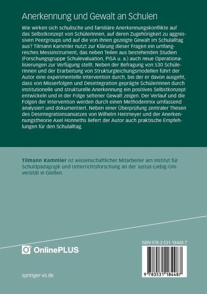 Wie wirken sich schulische und familiäre Anerkennungskonflikte auf das Selbstkonzept von SchülerInnen, auf deren Zugehörigkeit zu aggressiven Peergroups und auf die von ihnen gezeigte Gewalt im Schulalltag aus? Tilmann Kammler nutzt zur Klärung dieser Fragen ein umfangreiches Messinstrument, das neben Teilen aus bestehenden Studien (Forschungsgruppe Schulevaluation, PISA u. a.) auch neue Operationalisierungen zur Verfügung stellt. Neben der Befragungen von 530 SchülerInnen und der Erarbeitung von Strukturgleichungsmodellen führt der Autor eine experimentelle Intervention durch, bei der er davon ausgeht, dass von Misserfolgen und Desintegration geprägte SchülerInnen durch institutionelle und strukturelle Anerkennung ein positives Selbstkonzept entwickeln und in der Folge seltener Gewalt zeigen. Der Verlauf und die Folgen der Intervention werden durch einen Methodenmix umfassend analysiert und dokumentiert. Neben einer Überprüfung zentraler Thesen des Desintegrationsansatzes von Wilhelm Heitmeyer und der Anerkennungstheorie Axel Honneths liefert der Autor auch praktische Empfehlungen für den Schulalltag.