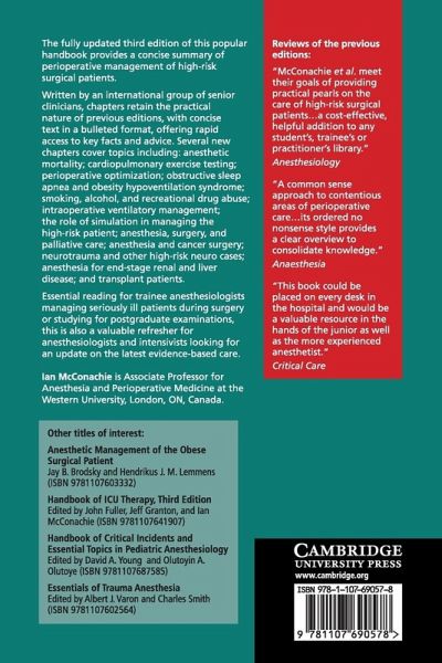 The fully updated third edition of this popular handbook provides a concise summary of perioperative management of high-risk surgical patients. Written by an international group of senior clinicians, chapters retain the practical nature of previous editions, with concise text in a bulleted format offering rapid access to key facts and advice. Several new chapters cover topics including: anesthetic mortality; cardiopulmonary exercise testing; perioperative optimization; obstructive sleep apnea and obesity hypoventilation syndrome; smoking, alcohol and recreational drug abuse; intraoperative ventilatory management; the role of simulation in managing the high-risk patient; anesthesia, surgery and palliative care; anesthesia and cancer surgery; neurotrauma and other high-risk neuro cases; anesthesia for end-stage renal and liver disease; and transplant patients. Essential reading for trainee anesthesiologists managing seriously ill patients during surgery or studying for postgraduate examinations, this is also a valuable refresher for anesthesiologists and intensivists looking for an update on the latest evidence-based care.