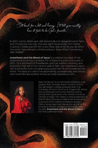 In 2021, twenty-three-year-old Jazmine Bunch stepped out on faith and moved to a new city. She was eight hours away from home, trusting in God's plan for her to be there. But what do you do when the worst-case scenario unfolds and your 'leap of faith' becomes a faith freefall? Anesthesia and the Blood of Jesus is a creative narrative of the experience surviving a random, life-threatening brain aneurysm in 2022. It's a testimony of heartbreak, spiritual warfare, recovery, and revelation that led to her current walk of faith. Her experience was a call to serve the God who graciously saved her life and preserved her mind. This story is a call to live abundantly, courageously, and simply LIVE to tell the stories that He has so richly blessed us with.
