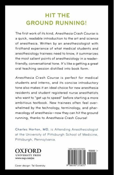 Anesthesia Crash Course is uniquely positioned to address the needs of new trainees in anesthesia. This book is written in a conversational tone, avoiding unnecessary jargon and distilling the key concepts of anesthesia into easy-to-remember tidbits - an approach in increasing demand by medical students and junior physicians. The audience for this book is chiefly new anesthesia residents, interns, medical students who rotate through anesthesia services, and nurse anesthetists. By demystifying the world of anesthesia, it provides a welcome resource to medical students and RNs who are considering additional training in this popular but poorly understood specialty. Surgical residents who feel they're not up to speed with what's happening on the other side of the "ether screen" would certainly also benefit from reading Anesthesia Crash Course. New anesthesia trainees face an extremely daunting learning curve. As they progress through training, they will read longer and more detailed treatises on every aspect of modern anesthesia. It is not realistic to imagine that someone might finish such a book in the first week of his or her training! Anesthesia Crash Course wil serve as a bridge between a trainee's pre-anesthesia experience and more formal training. It can be read in the last month of internship, or in evenings while completing the first few weeks of anesthesia training. It can also serve as a medical student's accompaniment for a two-week anesthesia elective.