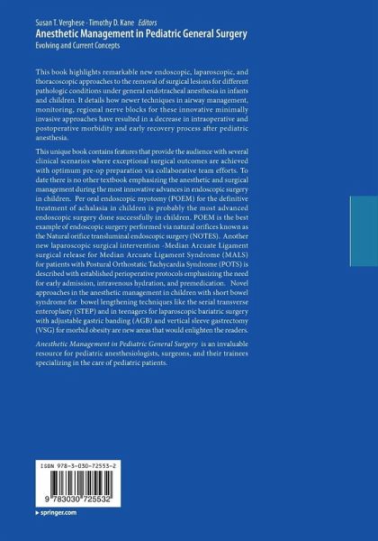 This unique book contains features that provide the audience with several clinical scenarios where exceptional surgical outcomes are achieved with optimum pre-op preparation via collaborative team efforts. To date there is no other textbook emphasizing the anesthetic and surgical management during the most innovative advances in endoscopic surgery in children. Per oral endoscopic myotomy (POEM) for the definitive treatment of achalasia in children is probably the most advanced endoscopic surgery done successfully in children. POEM is the best example of endoscopic surgery performed via natural orifices known as the Natural orifice transluminal endoscopic surgery (NOTES). Another new laparoscopic surgical intervention -Median Arcuate Ligament surgical release for Median Arcuate Ligament Syndrome (MALS) for patients with Postural Orthostatic Tachycardia Syndrome (POTS) is described with established perioperative protocols emphasizing the need for early admission, intravenous hydration, and premedication. Novel approaches in the anesthetic management in children with short bowel syndrome for bowel lengthening techniques like the serial transverse enteroplasty (STEP) and in teenagers for laparoscopic bariatric surgery with adjustable gastric banding (AGB) and vertical sleeve gastrectomy (VSG) for morbid obesity are new areas that would enlighten the readers.