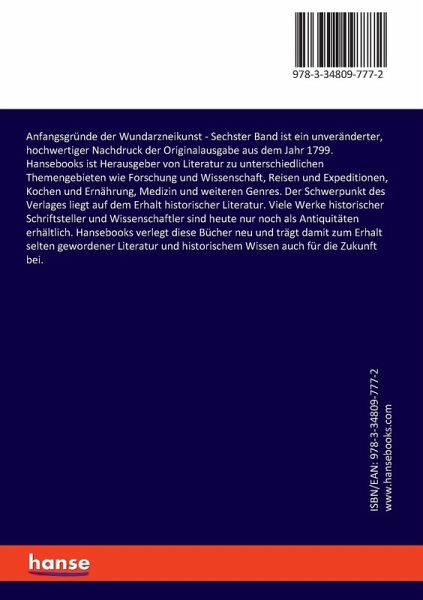 Anfangsgründe der Wundarzneikunst - Sechster Band ist ein unveränderter, hochwertiger Nachdruck der Originalausgabe aus dem Jahr 1799.Hansebooks ist Herausgeber von Literatur zu unterschiedlichen Themengebieten wie Forschung und Wissenschaft, Reisen und Expeditionen, Kochen und Ernährung, Medizin und weiteren Genres. Der Schwerpunkt des Verlages liegt auf dem Erhalt historischer Literatur. Viele Werke historischer Schriftsteller und Wissenschaftler sind heute nur noch als Antiquitäten erhältlich. Hansebooks verlegt diese Bücher neu und trägt damit zum Erhalt selten gewordener Literatur und historischem Wissen auch für die Zukunft bei.