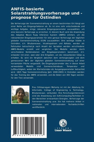 Die Vorhersage der Sonneneinstrahlung an einem bestimmten Ort hängt von einer Reihe von Eingangsfaktoren ab. Es ist eine sehr entscheidende und wichtige Aufgabe, einige relevante Eingangsparameter auszuwählen, um eine bessere Vorhersage zu erreichen. In diesem Buch wird die Anwendung des Adaptive Neuro Fuzzy Inference System (ANFIS) erörtert, um die relevantesten Eingangsparameter für eine genaue Vorhersage der täglichen globalen Sonneneinstrahlung (GSR) auszuwählen. Drei wichtige Städte in Ostindien, d.h. Bhubaneswar, Visakhapatnam und Kolkata, werden als Fallstudien betrachtet.Je nach Anzahl der Variablen werden verschiedene ANFIS-Modelle erstellt und verglichen. Die Modelle werden durch verschiedene Kombinationen von Eingabeparametern konstruiert, d.h. entweder mit einer, zwei oder drei Eingaben, um die relevantesten Sätze zu erhalten. Es wird ein Vergleich zwischen dem vorhergesagten und dem gemessenen Wert der täglichen globalen Sonneneinstrahlung auf einer horizontalen Fläche vorgestellt. Die Eingangsparameter des in dieser Arbeit verwendeten Modells sind Sonnenscheindauer, Temperatur und Luftfeuchtigkeit, wobei der Klarheitsindex als Ausgangsparameter betrachtet wird. 1825 Tage Sonneneinstrahlung (Jahr 2000-2005) in Ostindien werden für das Training des ANFIS verwendet, und die Daten von 365 Tagen werden für den Test verwendet.