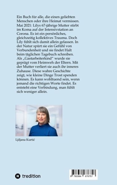 Ein Buch für alle, die einen geliebten Menschen oder ihre Heimat vermissen.Mai 2021: Lilys 67-jährige Mutter erkrankt an Corona. Nach dreizehn Tagen im Koma stirbt sie auf der Intensivstation. Ein persönliches, gleichzeitig kollektives Trauma. Doch Lily fühlt sich damit allein gelassen. In der Natur spürt sie ein Gefühl von Verbundenheit und sie findet Halt beim täglichen Tagebuch schreiben. Als "Gastarbeiterkind" wurde sie geprägt vom Heimweh der Eltern. Mit der Mutter verliert sie auch ihr inneres Zuhause. Diese wahre Geschichte zeigt, wie kleine Dinge Trost spenden können. Es kann wohltuend sein, wenn jemand die richtigen Worte findet. Es entsteht eine Verbindung, man fühlt sich weniger allein.