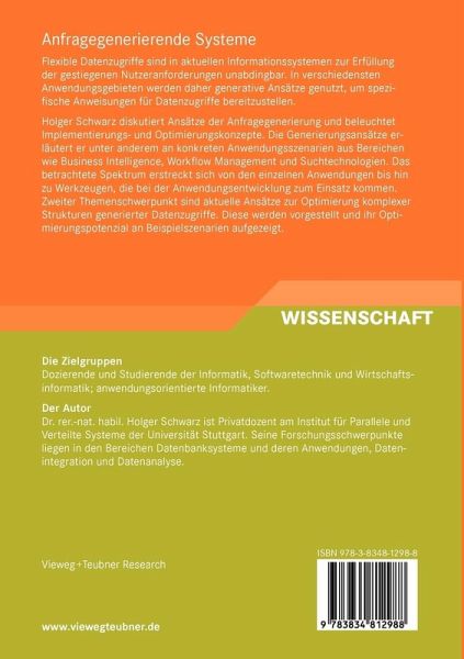 Holger Schwarz diskutiert Ansätze der Anfragegenerierung und beleuchtet Implementierungs- und Optimierungskonzepte. Die Generierungsansätze erläutert er unter anderem an konkreten Anwendungsszenarien aus Bereichen wie Business Intelligence, Workflow Management und Suchtechnologien. Das betrachtete Spektrum erstreckt sich von den einzelnen Anwendungen bis hin zu Werkzeugen, die bei der Anwendungsentwicklung zum Einsatz kommen. Zweiter Themenschwerpunkt sind aktuelle Ansätze zur Optimierung komplexer Strukturen generierter Datenzugriffe. Diese werden vorgestellt und ihr Optimierungspotenzial an Beispielszenarien aufgezeigt.