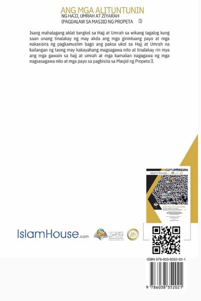 ANG MGA ALITUNTUNIN Ng Hajj, Umrah at Ziyarah Ang maikli nguni't madaling maunawaang alituntuning ito ay malugod na inilalahad sa lahat ng Muslim na naglalayong magsagawa ng Hajj sa Banal na Tahanan (Makkah) ng Dakilang Allah. Ito ay isang aklat na binigyan ng kaukulang balangkas para sa ilang mga ritwal ng Hajj at Umrah upang inyong mapag-aralan at inyong sanayin ang inyong mga sarili sa wastong pagsasakatuparan nito. An overview of the rites of Hajj, Umrah, and Ziyaarah in the light of Quran and Sunnah.Hajj is an annual religious pilgrimage to Mecca undertaken each year by millions of people from all over the world.Hajj is a sacred pilgrimage that is required of every Muslim at least once in their lifetime - it is one of the fifth pillars of Islam.Umrah is a pilgrimage that can be completed at any time of the year.The main purpose of Umrah is to clean the soul of past sins. A Muslim can perform Umrah more than once in a lifetime. Umrah is also seen as protection from poverty and the burdens of life, as a pilgrim is spending their wealth and time in the way of Allah.