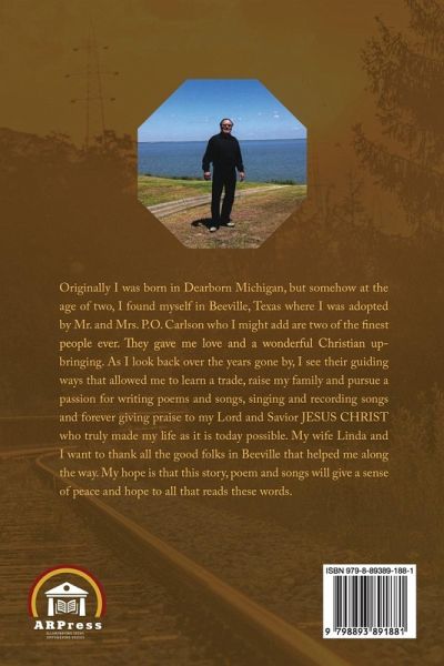 Originally I was born in Dearborn Michigan, but somehow at the age of two, I found myself in Beeville, Texas where I was adopted by Mr. and Mrs. P.O. Carlson who I might add are two of the ¿nest people ever. They gave me love and a wonderful Christian up-bringing. As I look back over the years gone by, I see their guiding ways that allowed me to learn a trade, raise my family and pursue a passion for writing poems and songs, singing and recording songs and forever giving praise to my Lord and Savior JESUS CHRIST who truly made my life as it is today possible. My wife Linda and I want to thank all the good folks in Beeville that helped me along the way. My hope is that this story, poem and songs will give a sense of peace and hope to all that reads these words.