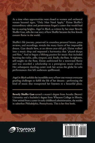 At a time when opportunities were closed to women and orchestral venues boasted signs, "Only Men Need Apply," Elaine Shaffer's extraordinary talent and perseverance forged a career that would lead her to soaring heights. Angel in Black, as written by her sister Beverly Shaffer Gast, tells the true story of how Shaffer became the first female concert flutist in the world. Shaffer's life journey, preserved in countless personal letters, press reviews, and recordings, reveals the many facets of her impossible dream. Gast details how, as an eleven-year-old girl, Elaine walked into a music shop and requested a harmonica that "played sharps and flats". And so began a lifelong passion for music that included learning the violin, cello, timpani, and, finally, the flute. At eighteen, self-taught on the flute, Elaine auditioned for a renowned flutist and was awarded a scholarship to a prestigious music school. Her subsequent dazzling career took her across the globe for solo performances that left audiences spellbound. Angel in Black unfolds the incredible story of how one woman overcame grueling challenges to fulfill the life of her dreams-performing the kind of music that transported her listeners to a beautiful place.