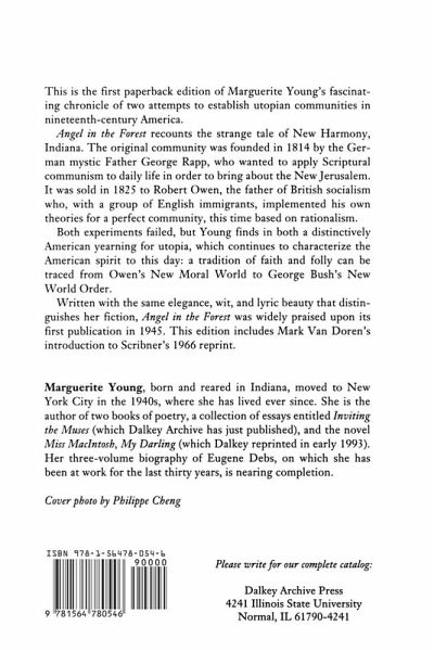This is the first paperback edition of Marguerite Young's fascinating chronicle of two attempts to establish utopian communities in nineteenth-century America.Angel in the Forest recounts the strange tale of New Harmony, Indiana. The original community was founded in 1814 by the German mystic Father George Rapp, who, with a group of English immigrants, implemented his own theories for a perfect community, this time based on rationalism. Both experiments failed, but Young finds in both a distinctively American yearning for utopia, which continues to characterize the American spirit to this day: a tradition of faith and folly can be traced from Owen's New Moral World to George Bush's New World Order. Written with the same elegance, wit, and lyric beauty that distinguishes her fiction, Angel in the Forest was widely praised upon its first publication in 1945. This edition includes Mark Van Doren's introduction to Scribner's 1966 reprint.