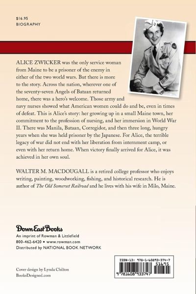 Alice Zwicker was the only service woman from Maine to be a prisoner of the enemy in either of the two World Wars. But there is more to the story than that. Across the nation, wherever one of the seventy-seven Angels of Bataan returned home, there was a hero’s welcome. Those Army and Navy nurses had shown what American women could do and be, even in times of defeat. This is Alice’s story: her growing up in a small Maine town, her commitment to the profession of nursing, and her immersion in World War II. There was Manila, Bataan, Corregidor, and then three long, hungry years when she was held prisoner by the Japanese. For Alice, the terrible legacy of war did not end with her liberation from internment camp, or even with her coming home. When victory finally arrived for Alice, it was achieved in her own soul.