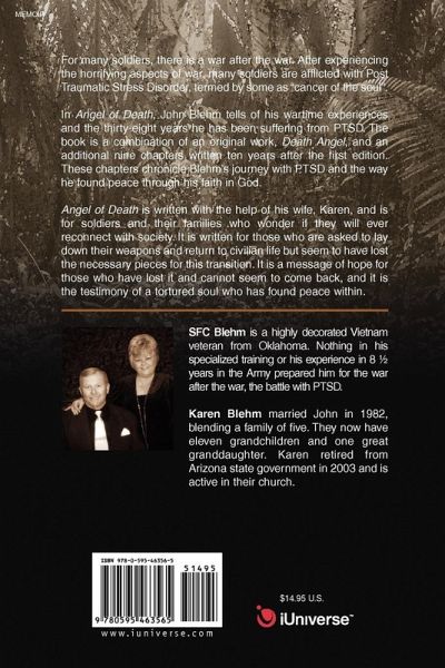 For many soldiers, there is a war after the war. After experiencing the horrifying aspects of war, many soldiers are afflicted with Post Traumatic Stress Disorder, termed by some as "cancer of the soul". In Angel of Death, John Blehm tells of his wartime experiences and the thirty-eight years he has been suffering from PTSD. The book is a combination of an original work, Death Angel, and an additional nine chapters written ten years after the first edition. These chapters chronicle Blehm's journey with PTSD and the way he found peace through his faith in God. Angel of Death is written with the help of his wife, Karen, and is for soldiers and their families who wonder if they will ever reconnect with society. It is written for those who are asked to lay down their weapons and return to civilian life but seem to have lost the necessary pieces for this transition. It is a message of hope for those who have lost it and cannot seem to come back, and it is the testimony of a tortured soul who has found peace within.
