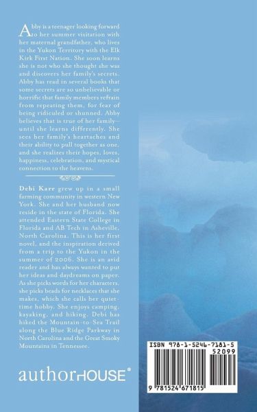 Abby is a teenager looking forward to her summer visitation with her maternal grandfather, who lives in the Yukon Territory with the Elk Kirk First Nation. She soon learns she is not who she thought she was and discovers her family’s secrets. Abby has read in several books that some secrets are so unbelievable or horrific that family members refrain from repeating them, for fear of being ridiculed or shunned. Abby believes that is true of her family—until she learns differently. She sees her family’s heartaches and their ability to pull together as one, and she realizes their hopes, loves, happiness, celebration, and mystical connection to the heavens.