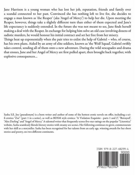 Jane Harrison is a young woman who has lost her job, reputation, friends and family over a scandal connected to her past. Convinced she has nothing left to live for, she decides to engage a man known as 'the Reaper' (aka 'Angel of Mercy') to help her die. Upon meeting the Reaper, however, things take a slightly different turn than either of them expected and Jane's life expectancy is suddenly extended. In the future she was not meant to see, Jane finds herself making a deal with the Reaper. In exchange for helping him solve an old case involving dozens of sadistic murders, he would honour his initial contract and set her free from her misery. Things heat up exponentially when the pair tries to enlist the help of Gabriel - who, of course, has his own plans. Aided by an army of elite soldiers, known as 'the Wolf Squad', Gabriel swiftly takes control, sending all of them onto a new adventure. During the wild sexcapades and drama that ensues, Jane and her Angel of Mercy are first pulled apart, then brought back together, with explosive consequences...