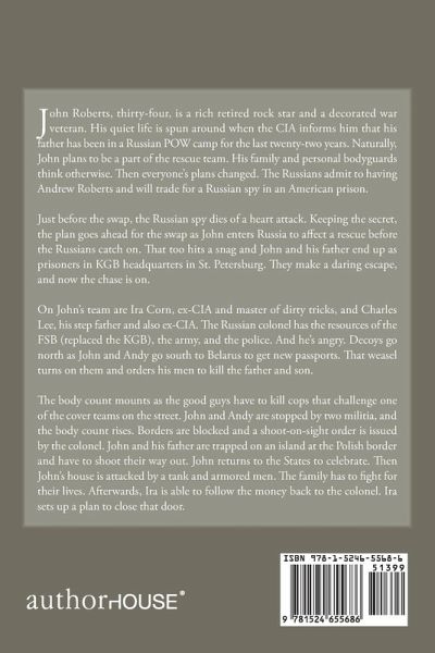 John Roberts, thirty-four, is a rich retired rock star and a decorated war veteran. His quiet life is spun around when the CIA informs him that his father has been in a Russian POW camp for the last twenty-two years. Naturally, John plans to be a part of the rescue team. His family and personal bodyguards think otherwise. Then everyone’s plans changed. The Russians admit to having Andrew Roberts and will trade for a Russian spy in an American prison. Just before the swap, the Russian spy dies of a heart attack. Keeping the secret, the plan goes ahead for the swap as John enters Russia to affect a rescue before the Russians catch on. That too hits a snag and John and his father end up as prisoners in KGB headquarters in St. Petersburg. They make a daring escape, and now the chase is on. On John’s team are Ira Corn, ex-CIA and master of dirty tricks, and Charles Lee, his step father and also ex-CIA. The Russian colonel has the resources of the FSB (replaced the KGB), the army, and the police. And he’s angry. Decoys go north as John and Andy go south to Belarus to get new passports. That weasel turns on them and orders his men to kill the father and son. The body count mounts as the good guys have to kill cops that challenge one of the cover teams on the street. John and Andy are stopped by two militia, and the body count rises. Borders are blocked and a shoot-on-sight order is issued by the colonel. John and his father are trapped on an island at the Polish border and have to shoot their way out. John returns to the States to celebrate. Then John’s house is attacked by a tank and armored men. The family has to fight for their lives. Afterwards, Ira is able to follow the money back to the colonel. Ira sets up a plan to close that door.
