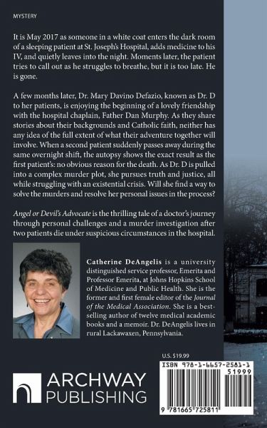 It is May 2017 as someone in a white coat enters the dark room of a sleeping patient at St. Joseph's Hospital, adds medicine to his IV, and quietly leaves into the night. Moments later, the patient tries to call out as he struggles to breathe, but it is too late. He is gone. A few months later, Dr. Mary Davino Defazio, known as Dr. D to her patients, is enjoying the beginning of a lovely friendship with the hospital chaplain, Father Dan Murphy. As they share stories about their backgrounds and Catholic faith, neither has any idea of the full extent of what their adventure together will involve. When a second patient suddenly passes away during the same overnight shift, the autopsy shows the exact result as the first patient's: no obvious reason for the death. As Dr. D is pulled into a complex murder plot, she pursues truth and justice, all while struggling with an existential crisis. Will she find a way to solve the murders and resolve her personal issues in the process? Angel or Devil's Advocate is the thrilling tale of a doctor's journey through personal challenges and a murder investigation after two patients die under suspicious circumstances in the hospital.