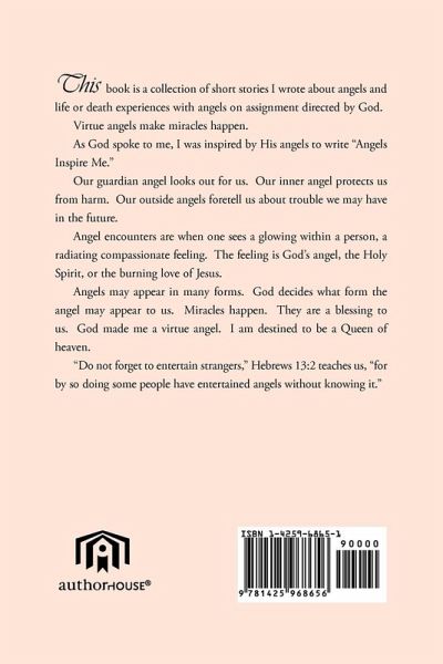 This book is a collection of short stories I wrote about angels and life or death experiences with angels on assignment directed by God. Virtue angels make miracles happen. As God spoke to me, I was inspired by His angels to write "Angels Inspire Me." Our guardian angel looks out for us. Our inner angel protects us from harm. Our outside angels foretell us about trouble we may have in the future. Angel encounters are when one sees a glowing within a person, a radiating compassionate feeling. The feeling is God's angel, the Holy Spirit, or the burning love of Jesus. Angels may appear in many forms. God decides what form the angel may appear to us. Miracles happen. They are a blessing to us. God made me a virtue angel. I am destined to be a Queen of heaven. "Do not forget to entertain strangers," Hebrews 13:2 teaches us, "for by so doing some people have entertained angels without knowing it."
