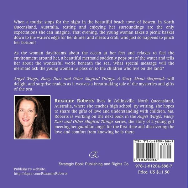 When a tourist stops for the night in the beautiful beach town of Bowen, in North Queensland, Australia, resting and enjoying her surroundings are the only expectations she can imagine. That evening, the young woman takes a picnic basket down to the water's edge for her dinner and meets a crab, who just so happens to pinch her bottom! As the woman daydreams about the ocean at her feet and relaxes to feel the environment around her, a beautiful mermaid suddenly pops out of the water and tells her about the wonderful world beneath the sea. What special message will the mermaid ask the young woman to pass on to the children who live on the land? Angel Wings, Faery Dust and Other Magical Things: A Story About Merpeople will delight and surprise readers as it weaves a breathtaking tale of the mysteries and gifts of the sea. Roxanne Roberts lives in Collinsville, North Queensland, Australia, where she teaches high school. By writing, she hopes to share the gifts of love and understanding with children. Ms. Roberts is working on the next book in the Angel Wings, Faery Dust and Other Magical Things series, the story of a young girl meeting her guardian angel for the first time and discovering the love and comfort from knowing he is there. Publisher's website: http://sbpra.com/RoxanneRoberts