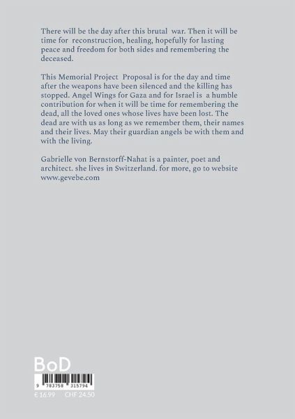 There will be the day after this brutal war. Then it will be time for reconstruction, healing, hopefully for lasting peace and freedom for both sides and remembering the deceased.This Memorial Project Proposal is for the day and time after the weapons have been silenced and the killing has stopped. Angel Wings for Gaza and for Israel is a humble contribution for when it will be time for remembering the dead, all the loved ones whose lives have been lost. The dead are with us as long as we remember them, their names and their lives. May their guardian angels be with them and with the living.Gabrielle von Bernstorff-Nahat is a painter, poet and architect. she lives in Switzerland. for more, go to website www.gevebe.com
