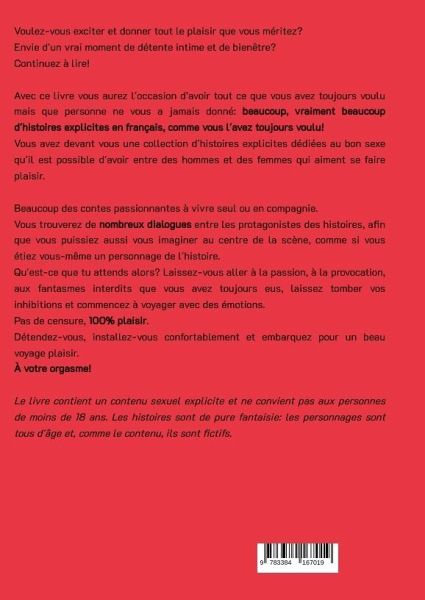 Voulez-vous exciter et donner tout le plaisir que vous méritez?Envie d'un vrai moment de détente intime et de bienêtre?Continuez à lire!Avec ce livre vous aurez l'occasion d'avoir tout ce que vous avez toujours voulu mais que personne ne vous a jamais donné: beaucoup, vraiment beaucoup d'histoires explicites en français, comme vous l'avez toujours voulu!Vous avez devant vous une collection d'histoires explicites dédiées au bon sexe qu'il est possible d'avoir entre des hommes et des femmes qui aiment se faire plaisir. Beaucoup des contes passionnantes à vivre seul ou en compagnie.Vous trouverez de nombreux dialogues entre les protagonistes des histoires, afin que vous puissiez aussi vous imaginer au centre de la scène, comme si vous étiez vous-même un personnage de l'histoire.Qu'est-ce que tu attends alors? Laissez-vous aller à la passion, à la provocation, aux fantasmes interdits que vous avez toujours eus, laissez tomber vos inhibitions et commencez à voyager avec des émotions.Pas de censure, 100 pour 100 de plaisir.Détendez-vous, installez-vous confortablement et embarquez pour un beau voyage plaisir.À votre orgasme!
