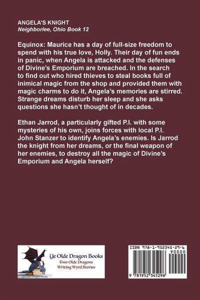 Equinox: Maurice has a day of full-size freedom to spend with his true love, Holly. Their day of fun ends in panic, when Angela is attacked and the defenses of Divine's Emporium are breached. In the search to find out who hired thieves to steal books full of inimical magic from the shop and provided them with magic charms to do it, Angela's memories are stirred. Strange dreams disturb her sleep and she asks questions she hasn't thought of in decades. Ethan Jarrod, a particularly gifted P.I. with some mysteries of his own, joins forces with local P.I. John Stanzer to identify Angela's enemies. Is Jarrod the knight from her dreams, or the final weapon of her enemies, to destroy all the magic of Divine's Emporium and Angela herself?