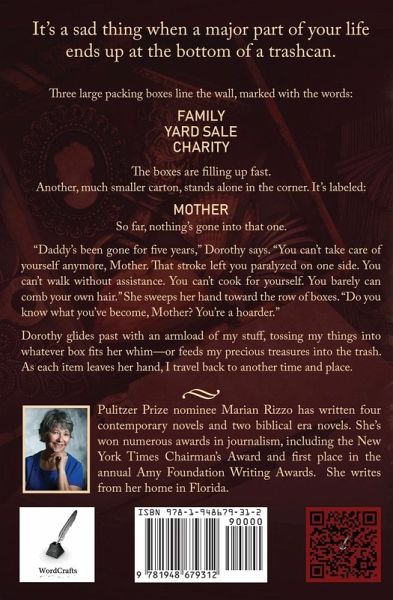 Where your heart is, there will your treasure be also. Matthew 6:21 A torn flyer from the 1939 World's Fair. Faded movie ticket stubs for Gone with the Wind and The Wizard of Oz. A bill of lading with my husband's signature scrawled at the bottom. A bent spoon from the soup kitchen where I volunteered to feed the homeless. A bullet casing from the assembly line where I worked during the war. A strip of black-and-white photos of Fredo and me making funny faces inside a booth at Coney Island. To my children, these are bits of useless junk--like me--things to be recycled, given away, or tossed casually into the trash without a second glance. To me, they are precious--like a pearl of great price, or a treasure hidden in a field. It's a sad thing when a major part of your life ends up at the bottom of a trashcan. Three large packing boxes line the wall, marked with the words Family Yard Sale Charity The boxes are filling up fast. Another, much smaller carton, stands alone in the corner. It's labeled Mother So far, nothing's gone into that one. "Daddy's been gone for five years," Dorothy said. "You can't take care of yourself anymore, Mother. That stroke left you paralyzed on one side. You can't walk without assistance. You can't cook for yourself. You barely can comb your own hair." She sweeps her hand toward the row of boxes. "Do you know what you've become, Mother? You're a hoarder." Dorothy glides past me with an armload of my stuff. She doesn't pause to ask my opinion, just tosses my personal things into whatever box fits her whim. Or she feeds my precious treasures into the trashcan. Then she moves on as if I'm not even here. As each item leaves my daughter's hand, I travel back to another time and place.