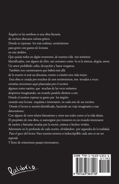 Ángeles en las sombras es una obra literaria de escritos obscuros cultura gótica. Donde se expresan los más realistas, sentimientos para gente con gustos de lecturas en este ámbito. Que quizás todos en algún momento, de nuestra vida nos sentimos Identificados, con alguno de ellos, tan comunes como lo es la tristeza, alegría, amor, Un amor prohibido, odio, decepción y hasta venganza. También nos cuestionamos que habrá más allá de la muerte si será un descanso, eterno u existirá otra vida mejor. Esta obra es creada por muchos de esos sentimientos, nos invaden a veces extrañas emociones aquí plasmadas por el escritor algunos como sueños, que muchas de las veces soñamos despiertos imaginando, un mundo paralelo distinto a este Donde el escritor expresa su gusto por los ángeles creando una lectura exquisita e interesante, en cada uno de sus escritos. Donde el lector se sentirá identificado, haciendo un viaje imaginario a esas dimensiones. Con alguno de estos relatos fantasiosos y otros tan reales como es la vida diaria. El propósito de esta obra, es sumergirse por instantes en ese mundo interesante de sueños y fantasías creadas por la mente ,misma o hechos vividos. Adentrarse en lo profundo de cada escrito, olvidándote por segundos de la realidad, Para el goce del lector. Pues nuestra esencia es indescriptible cada uno es un ser especial. Y lleno de misteriosos pasajes interesantes.