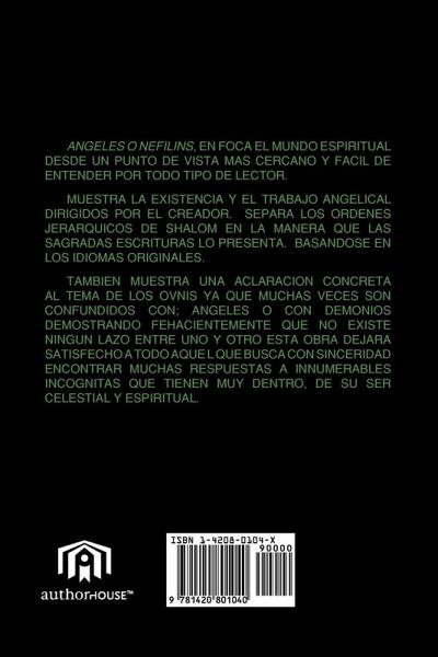 ANGELES O NEFILINS, EN FOCA EL MUNDO ESPIRITUAL DESDE UN PUNTO DE VISTA MAS CERCANO Y FACIL DE ENTENDER POR TODO TIPO DE LECTOR. MUESTRA LA EXISTENCIA Y EL TRABAJO ANGELICAL DIRIGIDOS POR EL CREADOR. SEPARA LOS ORDENES JERARQUICOS DE SHALOM EN LA MANERA QUE LAS SAGRADAS ESCRITURAS LO PRESENTA. BASANDOSE EN LOS IDIOMAS ORIGINALES. TAMBIEN MUESTRA UNA ACLARACION CONCRETA AL TEMA DE LOS OUNIS YA QUE MUCHAS VECES SON CONFUNDIDOS CON; ANGELES O CON DEMONIOS DEMOSTRANDO FEHACIENTEMENTE QUE NO EXISTE NINGUN LAZO ENTRE UNO Y OTRO ESTA OBRA DEJARA SATISFECHO A TODO AQUE L QUE BUSCA CON SINCERIDAD ENCONTRAR MUCHAS RESPEUESTAS A INNUMBERABLES INCOGNITAS QUE TIENEN MUY DENTRO, DE SU SER CELESTIAL Y ESPIRITUAL.