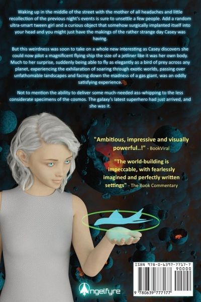 Waking up in the street with the mother of all headaches and little recollection of the previous night's events is sure to rattle a few people. Add a random ultra-smart tween girl that just won't go away and a curious object that surgically implanted itself into your head and you'll have the makings of the rather strange day Casey was having. But this weirdness was soon to take on a whole new interesting as Casey discovered she could now pilot a magnificent flying spacecraft the size of a jetliner like it was her own body. Much to her surprise, suddenly being able to fly as elegantly as a bird of prey across any planet, experiencing the exhilaration of soaring through exotic worlds, passing over unfathomable landscapes and facing down the madness of a gas giant, was an oddly satisfying experience. Not to mention the ability to deliver some much-needed ass-whipping to the less considerate specimens of the cosmos. The galaxy's latest superhero had just arrived, and she was it. Let the ambitious sky-shattering story take you on an extraordinary adventure as this colorful-eyed girl of mysterious origin forges a close relationship with an incredible angelic flying machine and its synthetically intelligent avatar. From its humble beginnings, Angelfyre is an immersive and deeply captivating journey of discovery and intrigue that will lead you through a diverse interstellar setting as our unlikely heroine fights to save the galaxy from total annihilation.