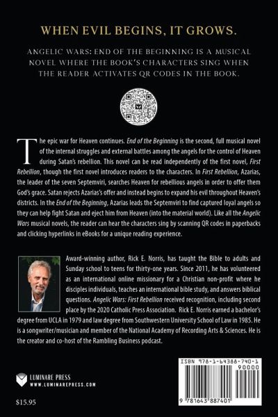 When evil begins, it grows. Angelic Wars: End of the Beginning is a musical novel where the book's characters sing when the reader activates QR codes in the book. The epic war for Heaven continues. End of the Beginning is the second, full musical novel of the internal struggles and external battles among the angels for the control of Heaven during Satan's rebellion. This novel can be read independently of the first novel, First Rebellion, though the first novel introduces readers to the characters. In First Rebellion, Azarias, the leader of the seven Septemviri, searches Heaven for rebellious angels in order to offer them God's grace. Satan rejects Azarias's offer and instead begins to expand his evil throughout Heaven's districts. In the End of the Beginning, Azarias leads the Septemviri to find captured loyal angels so they can help fight Satan and eject him from Heaven (into the material world). Like all the Angelic Wars musical novels, the reader can hear the characters sing by scanning QR codes in paperbacks and clicking hyperlinks in eBooks for a unique reading experience.