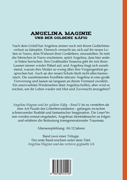 Nach dem Unfall hat Angelina immer noch mit ihrem Gedächtnisverlust zu kämpfen. Dennoch versucht sie, sich auf ihr neues Leben in Narro, dem Wohnort ihrer Großeltern, einzustellen. So nett die Menschen in Narro erscheinen, spürt Angelina, dass hier andere Sitten herrschen. Ihre Großmutter Susanna gibt ihr mit ihren Launen immer wieder Rätsel auf, und Angelina fragt sich zunehmend, warum ihre Mutter so wenig über ihre Vergangenheit gesprochen hat. Auch an der neuen Schule läuft nicht alles harmonisch. Die zunehmenden Konflikte stürzen Angelina in eine große Verwirrung und lassen sie langsam an ihrem Verstand zweifeln. Ein unerwartetes Wiedersehen lässt Angelina hoffen, aber wird es reichen, um ihr Leben wieder mit Mut und Zuversicht anzugehen? Angelina Maginie und der goldene Käfig - Band II ist zu verstehen als eine Art Puzzle des Unterbewusstseins - gefangen zwischen schmerzender Realität und fantastischer Imagination. Die Leser*innen werden erneut eingeladen, Angelinas Identitätssuche zu folgen und erfahren die Bedeutung transgenerationaler Traumata. Altersempfehlung: Ab 12 Jahren Band zwei einer Trilogie. Der erste Band erschien unter dem Titel: Angelina Maginie und das verloren geglaubte Ich