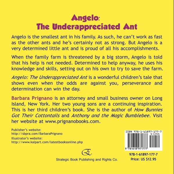 Angelo is the smallest ant in his family. As such, he can't work as fast as the other ants and he's certainly not as strong. But Angelo is a very determined little ant and is proud of all his accomplishments. When the family farm is threatened by a big storm, Angelo is told that his help is not needed. Determined to help anyway, he uses his knowledge and skills, setting out on his own to try to save the farm. Angelo: The Underappreciated Ant is a wonderful children's tale that shows even when the odds are against you, perseverance and determination can win the day. Barbara Prignano is an attorney and small business owner on Long Island, New York. Her two young sons are a continuing inspiration. This is her third children's book. She is the author of How Bunnies Got Their Cottontails and Anthony and the Magic Bumblebee. Visit her website at www.prignanobooks.com.