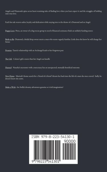 Seven heart-warming stories of true love. Each tale created with an angel and a diamond, in some form. Puppy Love- The sole owner of a dog rescue group is in trouble. Seeking financial assistance, she finds an unlikely funding source. Bride to Be- Bridal shop owner, Diamond, meets a man who seems vaguely familiar. Little does she know he will change her future Promise- Tauria's relationship with an Archangel reveals a forgotten past The Gift- Celeste's gift to her angel is a gift he may not want Hunted- Natasha's encounter with a mercenary has an unexpected, mutually beneficial outcome New Home- (Continuation from the book, Crossroads); Marisole's home search for a 'friend of a friend' thrusts her back into the life of a man she once craved. Sadly, he doesn't know she exists. Make a Wish- Are Stella's dreamy adventures genuine or vivid imagination? **Publisher's note: Paranormal romance and contemporary romance stories. BBW, angels. angel paranormal romance, HEA, anthology, short stories.**