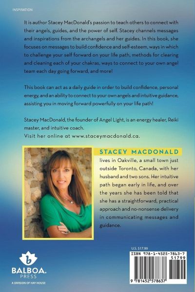 It is author Stacey MacDonald's passion to teach others to connect with their angels, guides, and the power of self. Stacey channels messages and inspirations from the archangels and her guides. In this book, she focuses on messages to build confidence and self-esteem, ways in which to challenge your self forward on your life path, methods for clearing and cleaning each of your chakras, ways to connect to your own angel team each day going forward, and more! This book can act as a daily guide in order to build confidence, personal energy, and an ability to connect to your own angels and intuitive guidance, assisting you in moving forward powerfully on your life path! Stacey MacDonald, the founder of Angel Light, is an energy healer, Reiki master, and intuitive coach. Visit her online at www.staceymacdonald.ca.