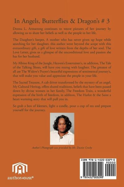 In Angels,Butterflies & Dragons # 3, Donna L. Armstrong continues to weave pictures of her journey by sharing her beliefs along with the people in her life. Inside the book:"The Daughters Keeper,this author went beyond the scope with this extraordinary gift,written from the depths of her soul. The Love Letter gives us a glimpse of the love and compassion she has for her husband. The Tale of the Talking Shoes will have you roaring with laughter.The greatest of all are; My Cultural Heritage which offers shared beliefs,traditions passed down by divine women in her family. The Sacred Treasure a cab driver transformed by the mystery of an angel".