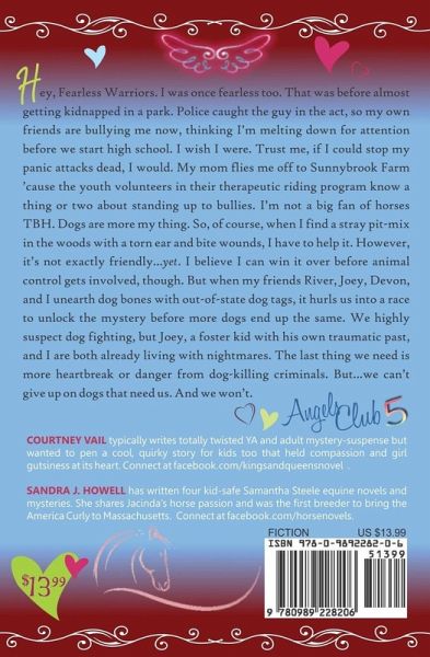 Hey, Fearless Warriors. I was once fearless too. That was before almost getting kidnapped in a park. Police caught the guy in the act, so my friends are bullying me now, thinking I'm melting down for attention before we start high school. I wish I were. Trust me, if I could stop my panic attacks dead, I would. My mom flies me off to Sunnybrook Farm 'cause the youth volunteers in their therapeutic riding program know a thing or two about standing up to bullies. I'm not a big fan of horses TBH. Dogs are more my thing. So, of course, when I find a stray pit-mix in the woods with a torn ear and bite wounds, I have to help it. However, it's not exactly friendly...yet. I believe I can win it over before animal control gets involved. But when my friends River, Joey, Devon, and I unearth dog bones with out-of-state dog tags, it hurls us into a race to unlock the mystery before more dogs end up the same. We highly suspect dog fighting, but Joey-a foster kid with his own traumatic past-and I are both already living with nightmares. The last thing we need is more heartbreak or danger from dog-killing criminals. But...we can't give up on dogs that need us. And we won't.