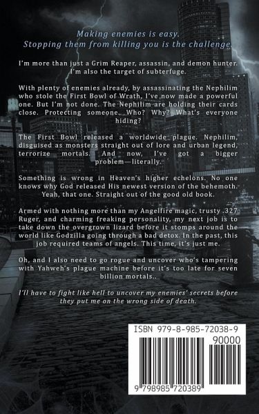 Making enemies is easy. Stopping them from killing you is the challenge. I'm more than just a Grim Reaper, assassin, and demon hunter. I'm also the target of subterfuge. With plenty of enemies already, by assassinating the Nephilim who stole the First Bowl of Wrath, I've now made a powerful one. But I'm not done. The Nephilim are holding their cards close. Protecting someone. Who? Why? What's everyone hiding? The First Bowl released a worldwide plague. Nephilim, disguised as monsters straight out of lore and urban legend, terrorize mortals. And now, I've got a bigger problem—literally. Something is wrong in Heaven's higher echelons. No one knows why God released His newest version of the behemoth. Yeah, that one. Straight out of the good old book. Armed with nothing more than my Angelfire magic, trusty .327 Ruger, and charming freaking personality, my next job is to take down the overgrown lizard before it stomps around the world like Godzilla going through a bad detox. In the past, this job required teams of angels. This time, it's just me. Oh, and I also need to go rogue and uncover who's tampering with Yahweh's plague machine before it's too late for seven billion mortals. I'll have to fight like hell to uncover my enemies' secrets before they put me on the wrong side of death.