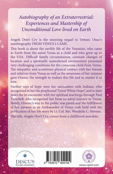 Autobiography of an Extraterrestrial Part 2: Experiences and Mastership of Unconditional Love lived on Earth Angels Don't Cry is the stunning sequel to Omnec Onec's autobiography FROM VENUS I CAME. This book is about the earthly life of the Venusian, who came to Earth from the astral Venus as a child and who grew up in the USA. Difficult family circumstances, constant changes of location and a spiritually unawakened environment presented very challenging conditions for the conscious child from Venus. The telepathic and sometimes physical contact with her friends and relatives from Venus as well as the awareness of her mission gave Omnec the strength to endure this life and to master it in love. Further rays of hope were her encounters with Indians, who recognized in her the prophesied "Great White Hope", and in later years the re-encounter with her spiritual teachings through Paul Twitchell, who recognized her from an astral journey to Venus. Slowly, Omnec's way to the public was paved and the fulfillment of her mission as an Ambassador of Venus took hold with the publication of her life story by Lt. Col. Ret. Wendelle C. Stevens. The title, Angels Don't Cry, comes from a childhood anecdote.