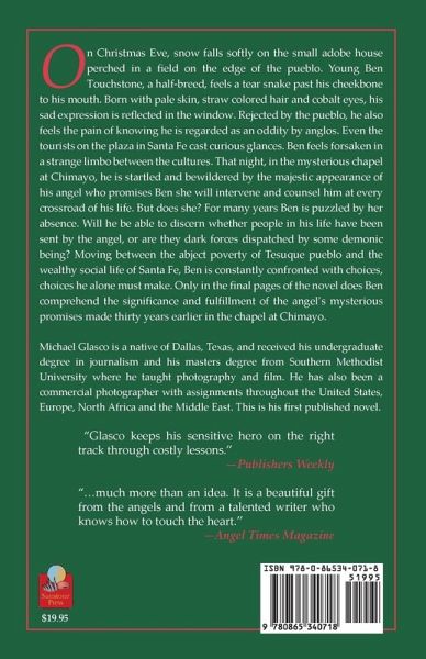 On Christmas Eve, snow falls softly on the small adobe house perched in a field on the edge of the pueblo. Young Ben Touchstone, a half-breed, feels a tear snake past his cheekbone to his mouth. Born with pale skin, straw colored hair and cobalt eyes, his sad expression is reflected in the window. Rejected by the pueblo, he also feels the pain of knowing he is regarded as an oddity by anglos. Even the tourists on the plaza in Santa Fe cast curious glances. Ben feels forsaken in a strange limbo between the cultures. That night, in the mysterious chapel at Chimayo, he is startled and bewildered by the majestic appearance of his angel who promises Ben she will intervene and counsel him at every crossroad of his life. But does she? For many years Ben is puzzled by her absence. Will he be able to discern whether people in his life have been sent by the angel, or are they dark forces dispatched by some demonic being? Moving between the abject poverty of Tesuque pueblo and the wealthy social life of Santa Fe, Ben is constantly confronted with choices, choices he alone must make. Only in the final pages of the novel does Ben comprehend the significance and fulfillment of the angel's mysterious promises made thirty years earlier in the chapel at Chimayo.