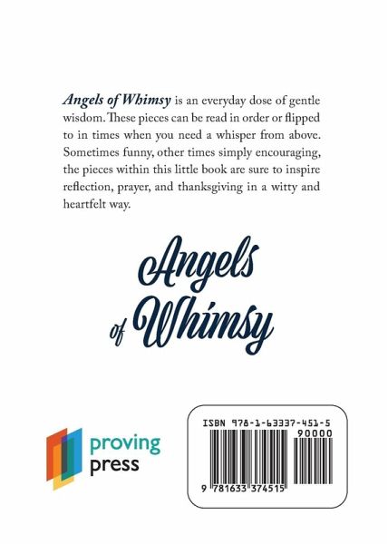 Angels of Whimsy is an everyday dose of gentle wisdom. These pieces can be read in order or flipped to in times when you need a whisper from above. Sometimes funny, other times simply encouraging, the pieces within this little book are sure to inspire reflection, prayer, and thanksgiving in a witty and heartfelt way.
