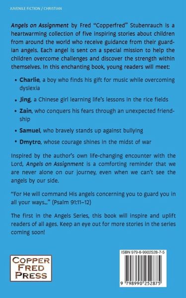 Angels on Assignment by Fred "Copperfred" Stubenrauch is a heartwarming collection of five inspiring stories about children from around the world who receive guidance from their guardian angels. Each angel is sent on a special mission to help the children overcome challenges and discover the strength within themselves. In this enchanting book, young readers will meet: Charlie, a boy who finds his gift for music while overcoming dyslexia Jing, a Chinese girl learning life's lessons in the rice fields Zain, who conquers his fears through an unexpected friendship Samuel, who bravely stands up against bullying Dmytro, whose courage shines in the midst of war Inspired by the author's own life-changing encounter with the Lord, Angels on Assignment is a comforting reminder that we are never alone on our journey, even when we can't see the angels by our side. "For He will command His angels concerning you to guard you in all your ways..." (Psalm 91:11-12) The first in the Angels Series, this book will inspire and uplift readers of all ages. Keep an eye out for more stories in the series coming soon!