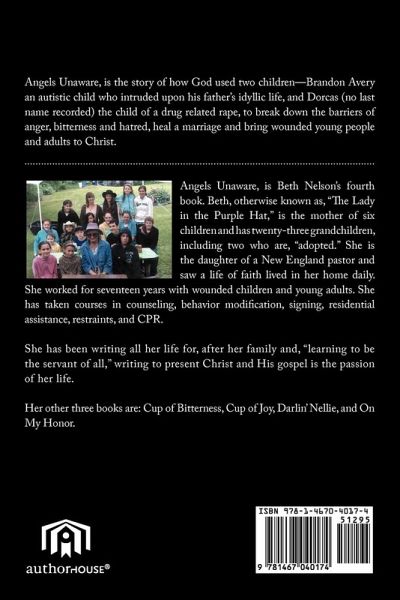 Angels Unaware, is the story of how God used two children-Brandon Avery an autistic child who intruded upon his father's idyllic life, and Dorcas (no last name recorded) the child of a drug related rape, to break down the barriers of anger, bitterness and hatred, heal a marriage and bring wounded young people and adults to Christ.