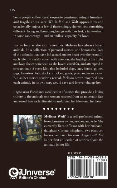Some people collect cars, exquisite paintings, antique furniture, and fragile china sets. While Melissa Wolf appreciates and occasionally enjoys a few of those things, she collects something different: living and breathing beings with four feet, a tail-which in some cases wags-and an endless capacity for love. For as long as she can remember, Melissa has always loved animals. In a collection of personal stories, she honors the lives of the animals that have left a mark on her heart over the years. In each tale intricately woven with emotion, she highlights the highs and lows she experienced as she loved, cared for, and attempted to save animals of every kind that included dogs, cats, horses, guinea pigs, hamsters, fish, ducks, chicken, goats, pigs, and even a cow. But as her stories tenderly reveal, Melissa never imagined how each animal, in its own way, would save and forever change her. Angels with Fur shares a collection of stories that provide a loving tribute to the animals one woman rescued from an uncertain fate and reveal how each ultimately transformed her life-and her heart.