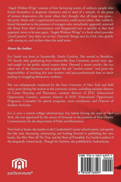 "Angels Without Wings" consists of four facinating stories of ordinary people who found themselves in desparate situations and in need of a miracle. At the point of utmost desparation... the point when they thought that all hope was gone.. the point where only a supernatural occurrance could succor them, they suddenly found themselves in the presence of strangers who miraclously appeared, removed the threat from their circumstance and disappeared just as quickly as they had appeared, never to be seen again. "Angels Without Wings" is a book which provides "proof positive" that there are in fact, Heavenly Beings sent by God, who quietly walk amoung us, and surface when the need arises.