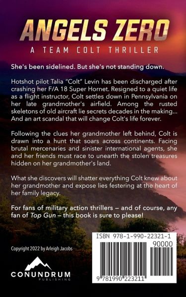 Hotshot pilot Talia "Colt" Levin has been discharged after crashing her F/A 18 Super Hornet. Resigned to a quiet life as a flight instructor, Colt settles down in Pennsylvania on her late grandmother's airfield. Among the rusted skeletons of old aircraft lie secrets decades in the making... And an art scandal that will change Colt's life forever. Following the clues her grandmother left behind, Colt is drawn into a hunt that soars across continents. Facing brutal mercenaries and sinister international agents, she and her friends must race to unearth the stolen treasures hidden on her grandmother's land. What she discovers will shatter everything Colt knew about her grandmother and expose lies festering at the heart of her family legacy.