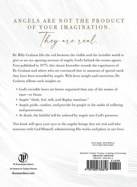 Yes, angels are real. They are not the product of your imagination. An in-depth study on angels and the heavenly host, Billy Graham walks you through how the angelic armies work like an organization in God's Kingdom, how they differ from man, Lucifer and fall, and much more. Interest in angels and the supernatural aspects of God's Kingdom is more heightened than ever. Even if you've read the latest book, seen the most recent TV show, or heard your grandmother's deathbed story countless times, you are missing something important if you have not read Billy Graham's in-depth biblical study of angels. * God's invisible hosts are better organized than any of the armies of man--or Satan. * Angels "think, feel, will, and display emotions." * Angels guide, comfort, and provide for people in the midst of suffering and persecution. * At death, the faithful will be ushered by angels into the presence of God. Angels has sold more than 3 million copies. Dr. Graham's knowledge and perspective will make you aware of the angelic beings that are real and who associate with God Himself, administering His works and plans in our lives.