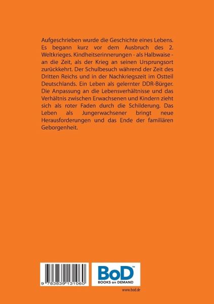 Aufgeschrieben wurde die Geschichte eines Lebens. Es begann kurz vor dem Ausbruch des 2. Weltkrieges. Kindheitserinnerungen - als Halbwaise - an die Zeit, als der Krieg an seinen Ursprungsort zurückkehrt. Der Schulbesuch während der Zeit des Dritten Reichs und in der Nachkriegszeit im Ostteil Deutschlands. Ein Leben als gelernter DDR-Bürger. Die Anpassung an die Lebensverhältnisse und das Verhältnis zwischen Erwachsenen und Kindern zieht sich als roter Faden durch die Schilderung. Das Leben als Jungerwachsener bringt neue Herausforderungen und das Ende der familiären Geborgenheit.