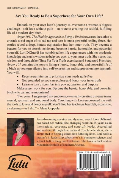 Are You Ready to Be a Superhero for Your Own Life? Embark on your own hero's journey to overcome a woman's biggest challenge-self-love without guilt-en route to creating the soulful, fulfilling life of a modern-day bitch. Anger 101 showcases the author's crusade to rid anger of its bad rap and turn it into a powerful healing force. Her stories reveal a deep, honest exploration into her inner truth. They become a beacon for you to search inside and become heroic, honorable, and powerful yourself. Lori DiGuardi has combined her life experiences, academic knowledge, and soul's wisdom to help you open to your inner truth. She makes that wisdom real through her Time For Your Truth exercises and Suggested Practices. Anger 101 contains the keys to living a heroic, honorable, and powerful life of a bitch as you turn silence into self-expression, suppression into strength, discomfort into power. Make anger work for you. Become the heroic, honorable, and powerful bitch who can move mountains!