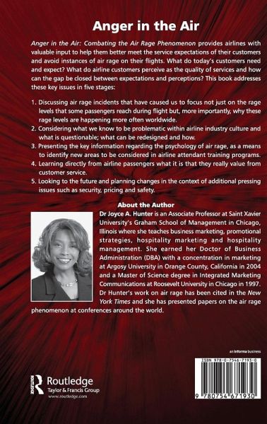 Dr Joyce A. Hunter is an Associate Professor at Saint Xavier University's Graham School of Management in Chicago, Illinois where she teaches business marketing, promotional strategies, hospitality marketing and hospitality management. She earned her Doctor of Business Administration (DBA) with a concentration in marketing at Argosy University in Orange County, California in 2004 and a Master of Science degree in Integrated Marketing Communications at Roosevelt University in Chicago in 1997. Dr Hunter's work on air rage has been cited in the New York Times and she has presented papers on the air rage phenomenon at conferences around the world. Before entering academia, Dr Hunter learned about air rage first-hand from working more than 25 years at a major American airline. There she gained broad experience in professional marketing and became a leader in customer service as she rose from airline reservationist, ticket sales agent and administrator to sales promotion expert and a corporate account manager. She is also a Certified Travel Counselor (CTC) who has traveled extensively throughout the United States, Europe, Asia, and Africa. Dr Hunter's research continues to focus on pinpointing the causes of passenger meltdowns, especially what she calls the "Triple-A Triggers" of rage: alcohol, anxiety and anger. Her findings have made Dr Hunter a staunch advocate for excellent customer service as a key strategy for reducing air rage.